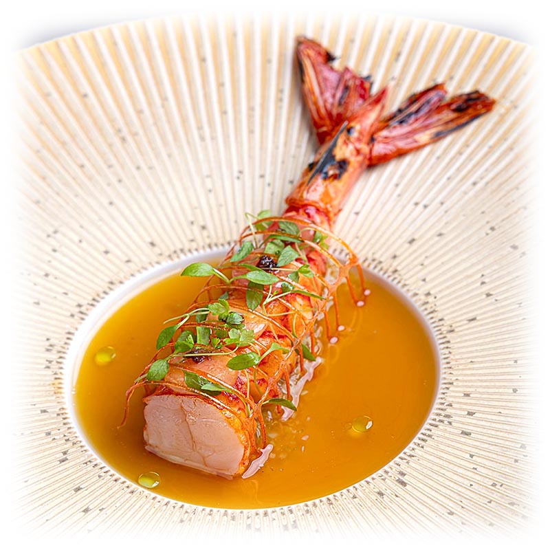 Commonly known as the Norway lobster, scampi, or langoustine, it’s a small coral-colored crustacean found in the northeast Atlantic & Mediterranean sea. While sometimes called crayfish, it is more closely related to the lobster and is distinct from prawns. It has a sweet, mild taste and a firm, white flesh. It is prized for its flavor and is prepared in various ways, such as boiling, roasting, or frying, often served with lemon and butter sauce. It can be grilled, steamed or pan-fried, and is ideal mixed with other shellfish, such as shrimps and king crab, in dishes like casseroles and soups.