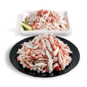 Cooked Golden King Crab (Lithodes Aequispinus) combo meat (40% leg /60% body) in a 380gr vacuum pack, frozen.